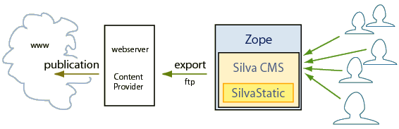 SilvaStatic is a Silva extension that allows users to export a static copy of content maintained in Silva to an external website. This allows an organization to run Silva to manage content, but export the content to a simple external web server, for instance at an internet provider. The only thing the web server needs to support is the serving of static files. There also needs to be FTP access so the static files can be copied to the server.